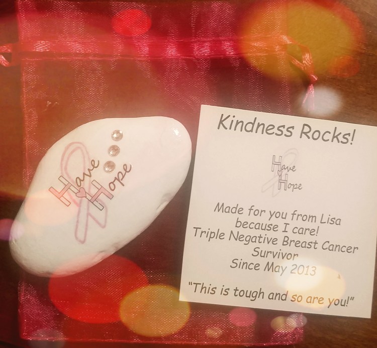 I am a triple negative breast cancer survivor who paints and donates kindness rocks for cancer patients in the Denver metro area. I know how tough surgery, treatment and recovery are! If I can give a positive feeling to one cancer patient, then my mission is accomplished!
